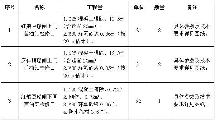 一、采購(gòu)內(nèi)容:紅船豆、安仁輔船閘閘首油缸檢修口擴(kuò)孔改造,詳見下表,采購(gòu)預(yù)算價(jià)為人民幣66000元。