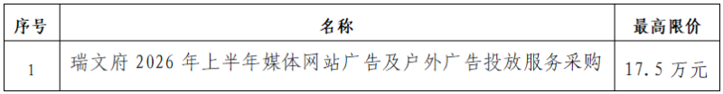 一、采購項目名稱:瑞文府2026年上半年媒體網(wǎng)站廣告及戶外廣告投放服務(wù)采購項目