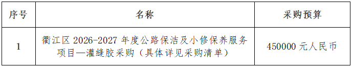 根據(jù)《衢州市市屬國有企業(yè)采購管理辦法(試行)》規(guī)定,以公開詢價方式對衢江區(qū)2026-2027年度公路保潔及小修保養(yǎng)服務(wù)項目施工所需灌縫膠進行采購,歡迎合格的供應(yīng)商參加。
