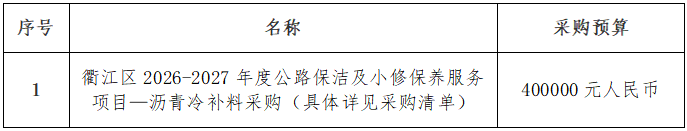 一、項(xiàng)目名稱:衢江區(qū)2026-2027年度公路保潔及小修保養(yǎng)服務(wù)項(xiàng)目——瀝青冷補(bǔ)料采購(gòu)