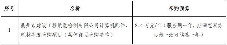 一、項(xiàng)目名稱:衢州市建設(shè)工程質(zhì)量檢測(cè)有限公司計(jì)算機(jī)配件、耗材年度采購(gòu)項(xiàng)目