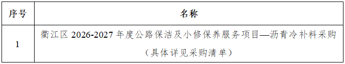 一、采購(gòu)項(xiàng)目名稱:衢江區(qū)2026-2027年度公路保潔及小修保養(yǎng)服務(wù)項(xiàng)目——瀝青冷補(bǔ)料采購(gòu)