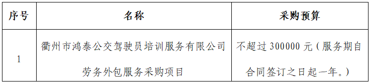 一、項(xiàng)目名稱(chēng):衢州市鴻泰公交駕駛員培訓(xùn)服務(wù)有限公司勞務(wù)外包服務(wù)采購(gòu)項(xiàng)目