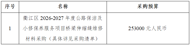 一、項(xiàng)目名稱(chēng):衢江區(qū)2026-2027年度公路保潔及小修保養(yǎng)服務(wù)項(xiàng)目橋梁伸縮縫維修材料采購(gòu)。