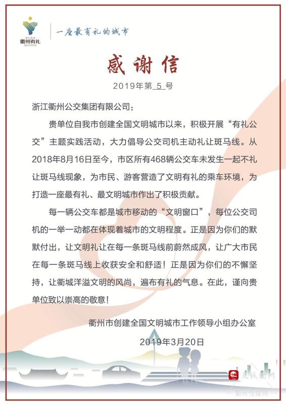 市交通投資集團(tuán)有限公司副總經(jīng)理葉建國(guó)表示,“這封感謝信讓我們倍感驚喜和意外,我們將繼續(xù)通過(guò)有禮公交的打造,宣傳衢州有禮的品牌形象,制定更嚴(yán)密的措施,為創(chuàng)建全國(guó)文明城市添磚加瓦。”