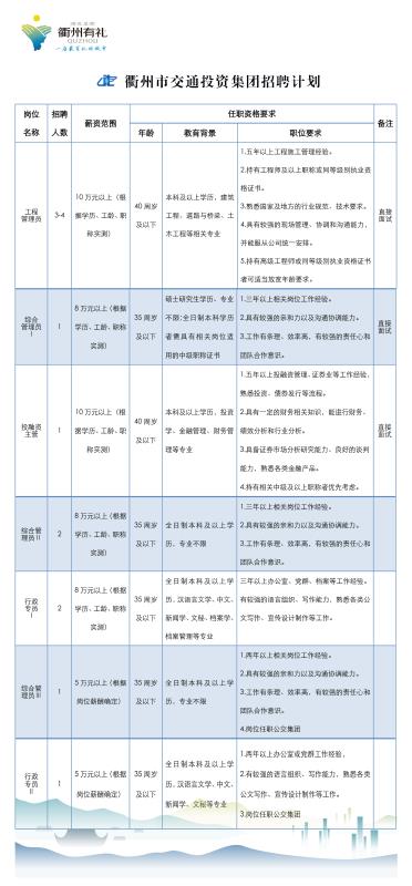 衢州市交通投資集團(tuán)有限公司根據(jù)集團(tuán)發(fā)展需要,擬面向社會公開招聘工作人員,具體工作單位由集團(tuán)根據(jù)工作需要,在集團(tuán)本部和全資子公司之間進(jìn)行統(tǒng)籌安排。具體招聘事項安排如下: