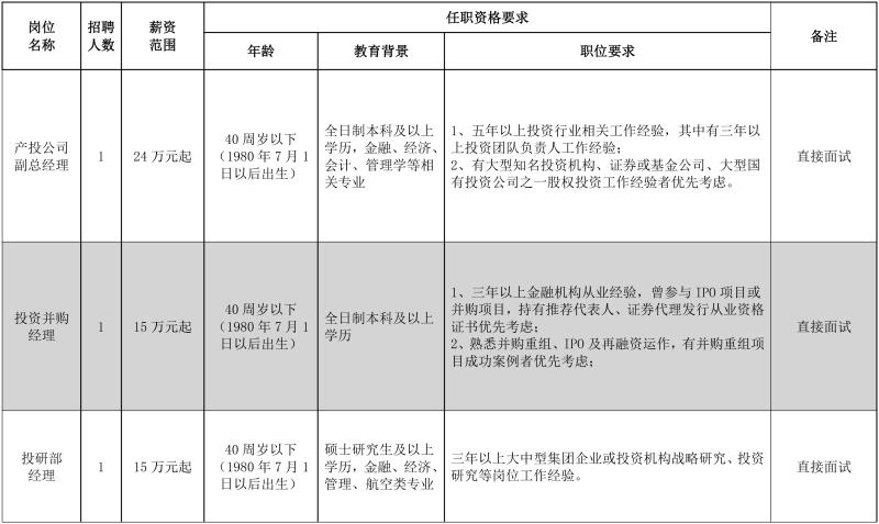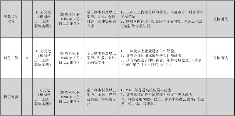2、產(chǎn)投公司副總經(jīng)理、投資并購(gòu)經(jīng)理、投研部經(jīng)理、風(fēng)險(xiǎn)控制主管、財(cái)務(wù)主管五個(gè)崗位采用直接面試形式,報(bào)名人員通過(guò)資格審查后進(jìn)入面試環(huán)節(jié)。